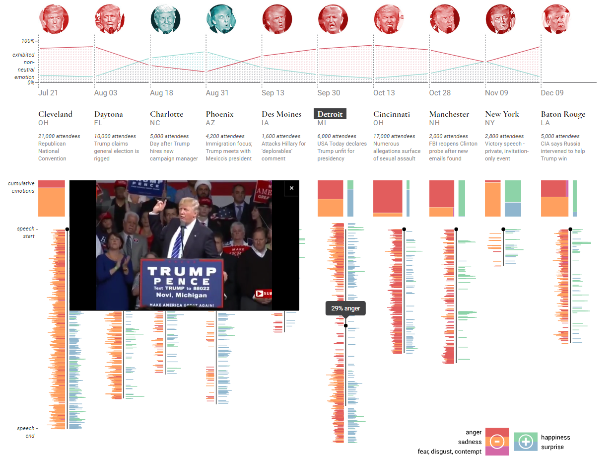 This data visual mixes interactive elements as well as video elements to create a completely immersive experience. The interactive charts reveal information as well as match video segments for each dominant emotion.